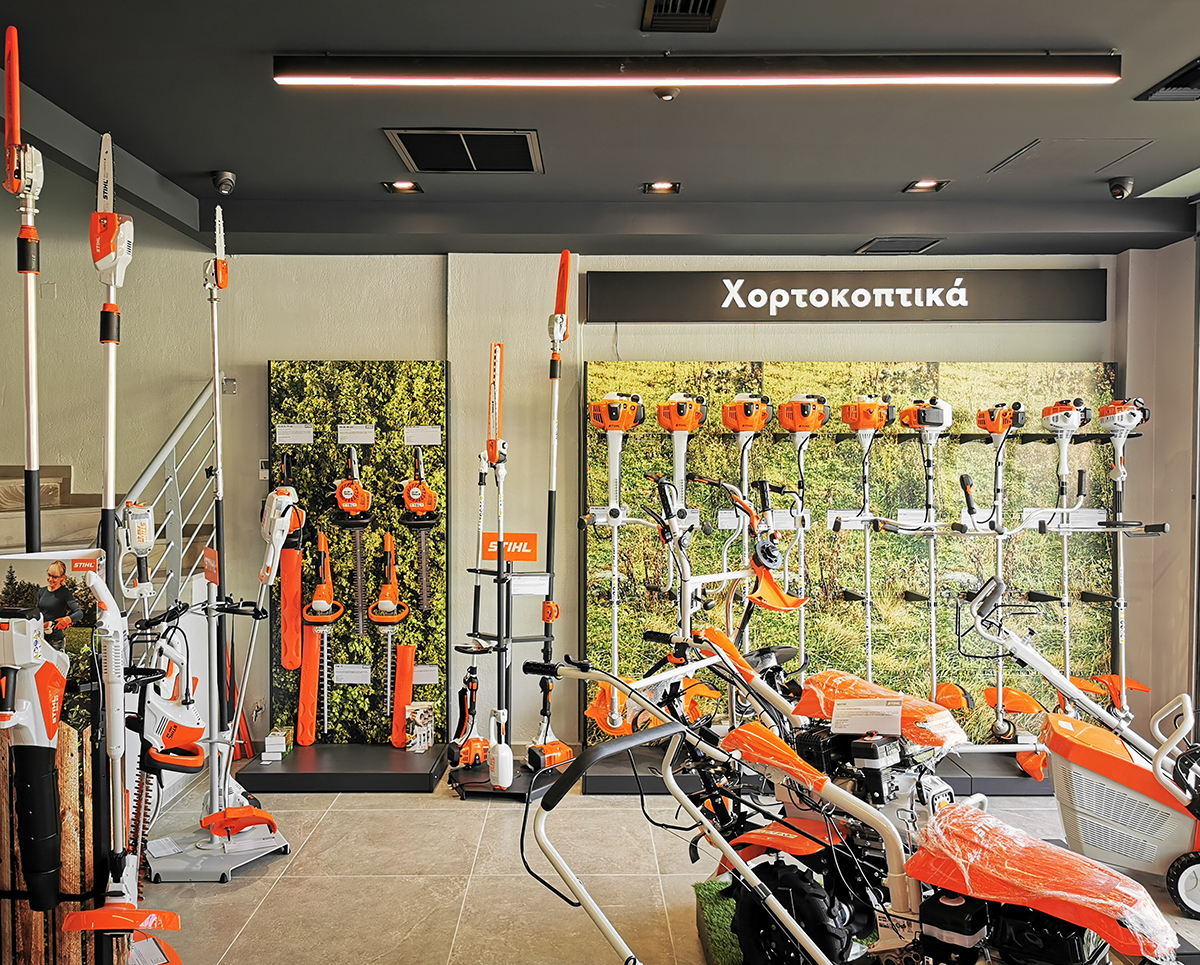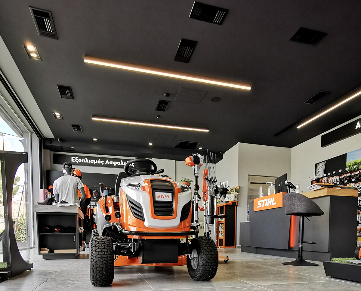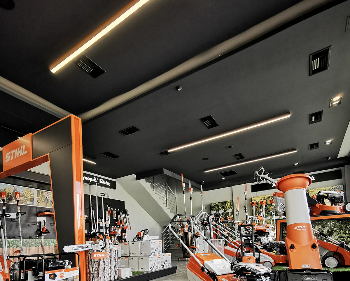 Η αναβάθμιση του φωτισμού στο κατάστημα της αλυσίδας STIHL σχεδιάστηκε για να αναδείξει κάθε προϊόν με ακρίβεια και επαγγελματισμό, δημιουργώντας ένα περιβάλλον όπου οι επισκέπτες μπορούν να αξιολογήσουν τα εργαλεία και τα μηχανήματα με άνεση και σαφήνεια. Οι φωτιστικές λύσεις επιλέχθηκαν ώστε να αναδεικνύουν τα υλικά, τις υφές και τις λεπτομέρειες των προϊόντων, υποστηρίζοντας παράλληλα την ευχρηστία του προσωπικού. Ο φωτισμός καλύπτει κάθε γωνία του καταστήματος, από τις εκθεσιακές προθήκες μέχρι τις επιφάνειες εργασίας, εξασφαλίζοντας ομοιομορφία, καθαρότητα και άνετη οπτική εμπειρία. Το αποτέλεσμα είναι ένας χώρος που συνδυάζει λειτουργικότητα, αισθητική και επαγγελματική εικόνα, ενισχύοντας την εμπιστοσύνη των πελατών στο brand STIHL.