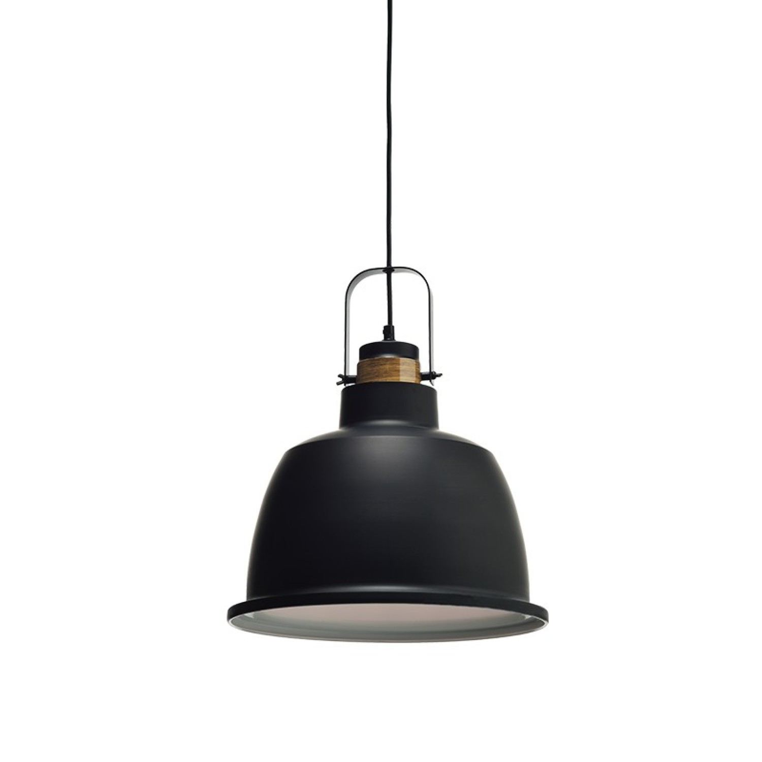 Μεταλλικό κρεμαστό φωτιστικό σε vintage γραμμή, μαύρο ματ εξωτερικά και λευκό εσωτερικά, με λεπτομέρεια σε απόχρωση ξύλου.