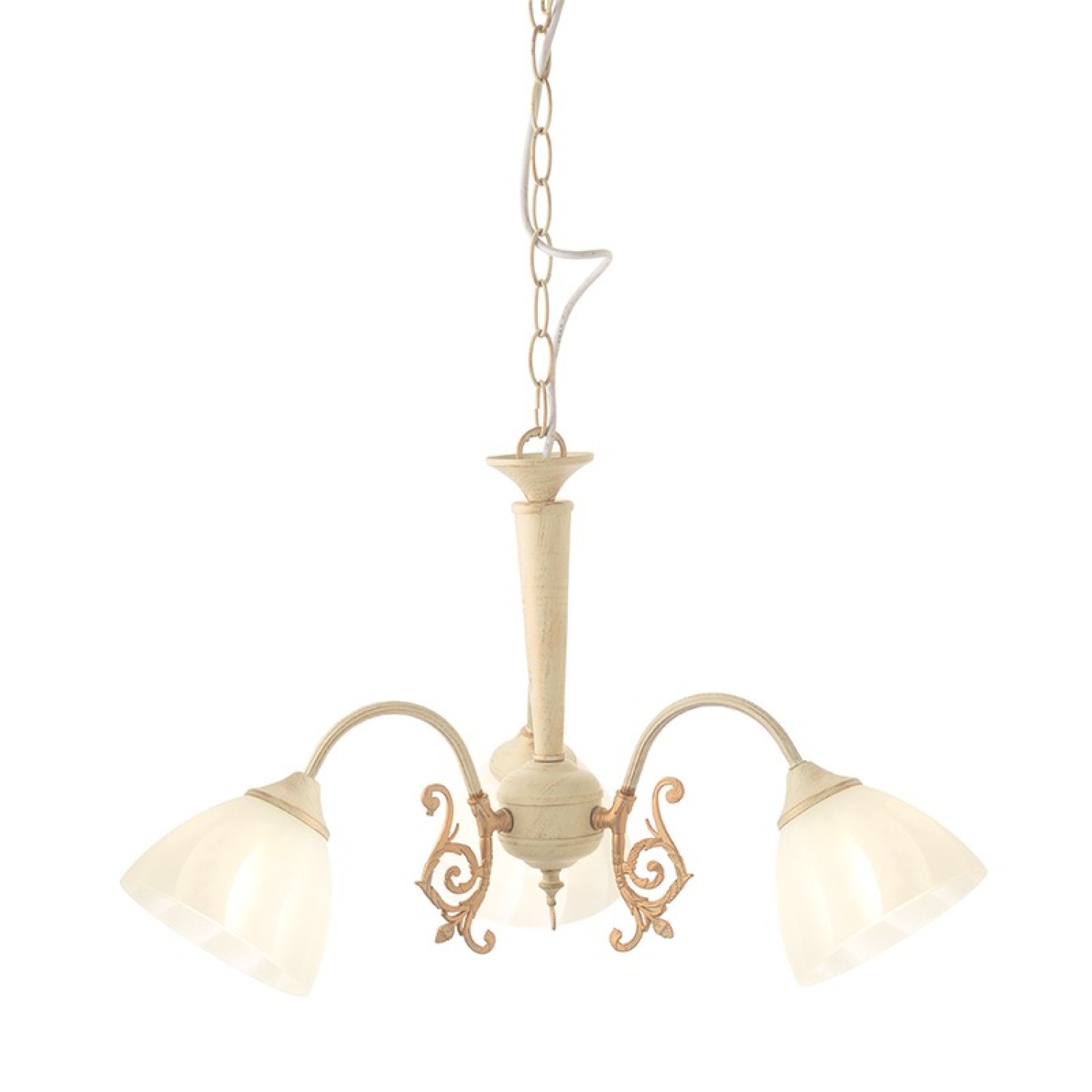 Κρεμαστό λευκό πατίνα μεταλλικό φωτιστικό με αντικέ χρυσές λεπτομέρειες και λευκό γυαλί αμμοβολής.
